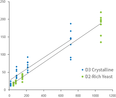 過去有很多專家、學者認為 D3 比 D2 生物利用效果比較好,甚至有人引用以偏概全的數據認為 D2不適合做為營養補充劑,但事實上,最近有越來越多的研究都顯示 D2 和 D3 生物利用率一樣好,因為不論維生素 D2 或維生素 D3,到人體皆須2次轉化成活性 D (1, 25 (OH) 2D) 才能發揮作用,因此宣稱 D3 效果比較好的業者,在美國 FDA、國家衛生研究院 NIH、歐盟食品安全署 EFSA 及 Lallemand 原廠的產官學方證實下,遭打臉 !